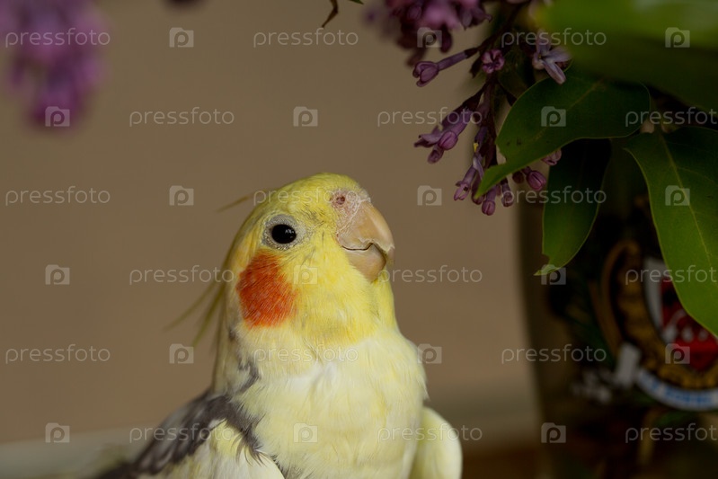 Желтый попугай корелла с красными щеками и длинными перьями
