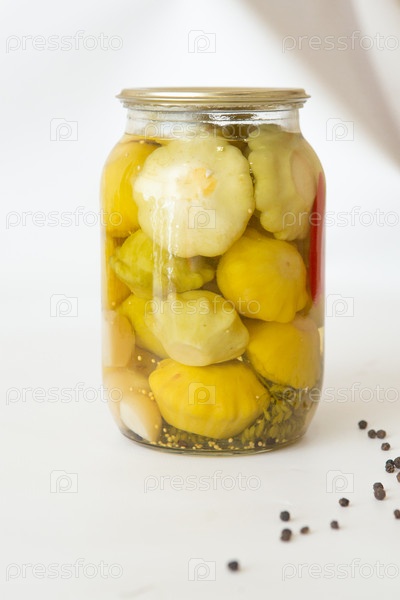 Банка с маринованными желтыми гребешками, домашние маринованные патиссоны