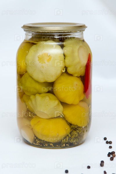 Банка с маринованными желтыми гребешками, домашние маринованные патиссоны