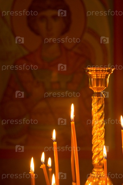 Свечи горят, стоят в церковном подсвечнике. Храм
