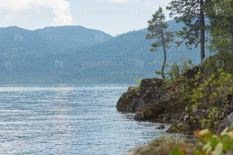 Телецкое озеро со спокойной водой в летний день. Алтайский край