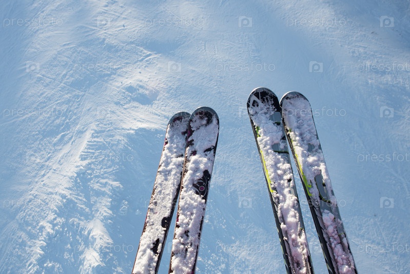 Две пары лыж на склоне холма в зимний день