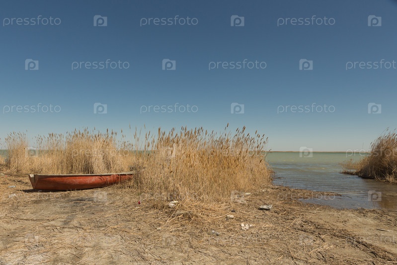 Гребные лодки в камышах. Деревянная лодка на травянистом берегу Аральского моря в летний день
