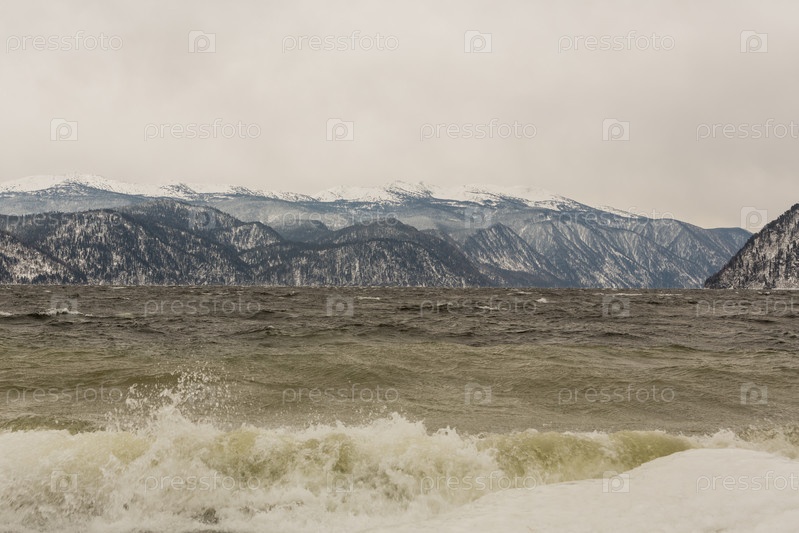 Береговая линия Телецкого озера с грохочущими волнами зимой. Россия, Алтайский край