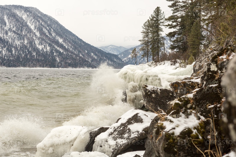 Береговая линия Телецкого озера с грохочущими волнами зимой. Россия, Алтайский край