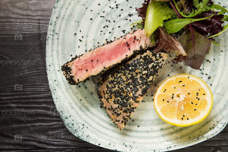 Домашний стейк из тунца на гриле с кунжутом и соевым соусом