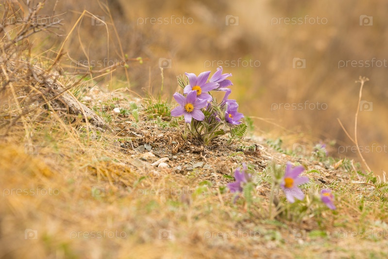 Весенний фиолетовый красочный цветок на лугу Крупноцветковые воробьины - Pulsatilla vulgaris