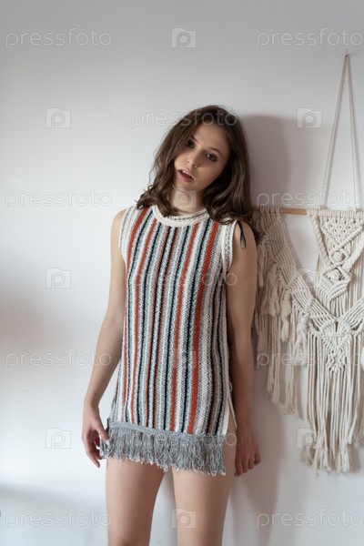 Молодая красивая женщина позирует в коротком платье в студии