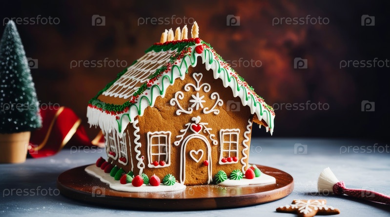 Празднично украшенный пряничный домик, украшенный разноцветной глазурью и сладостями