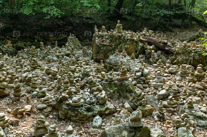 Пирамиды из плоских камней в русле пересохшей горной реки