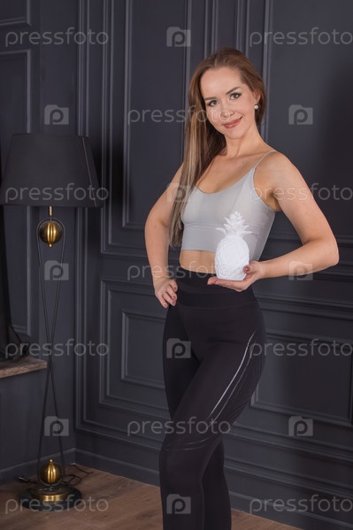 Фитнес-тренер девушка европейской национальности, с ананасом в руках
