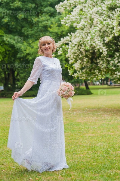 НЕВЕСТА в белом платье и с букетом цветов