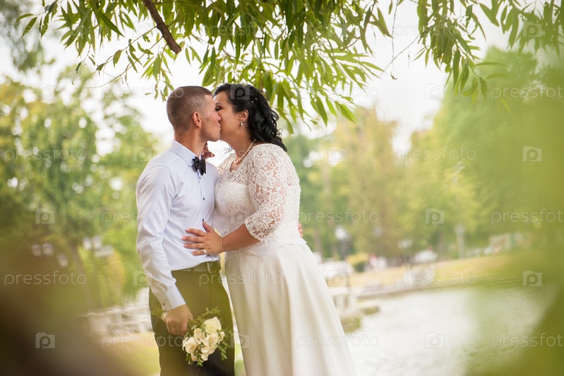 Молодожены позируют у воды, озера или реки