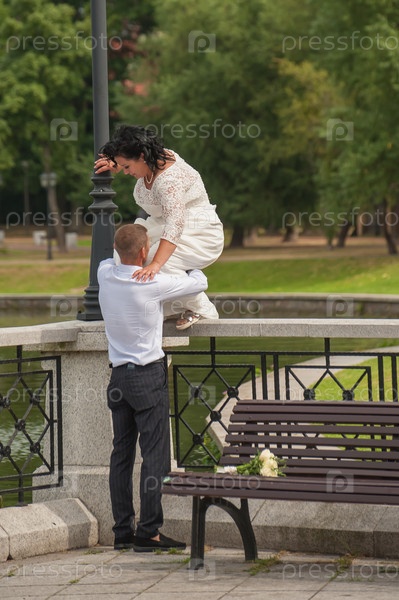 Молодожены жених и невеста на свадьбе возле пруда