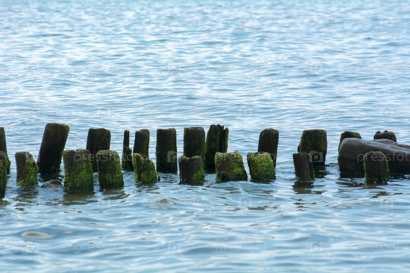Деревянные стволы, похожие на столбы, стоят в ряд в воде и используются в качестве волнорезов