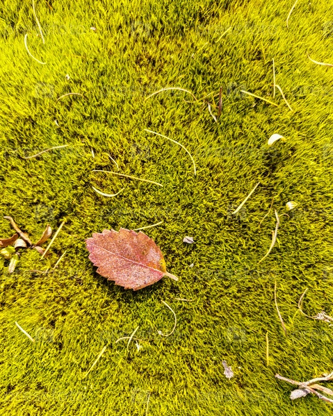 Осенние листья в лесу. Красный осенние листья. ярко-красный лист лежит на подстилке из мха в лесу. осенние листья на земле