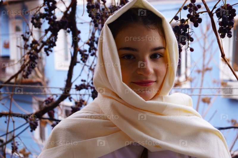 Девушка в платке на фоне виноградных лоз