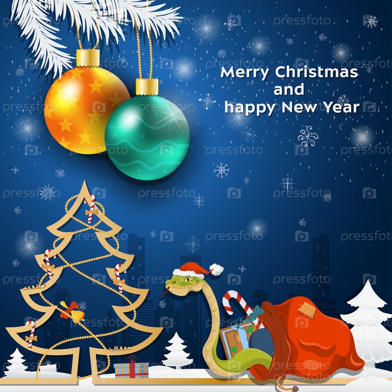 Рождественские и новогодние поздравления Рождественские шары висят на ветках деревьев змея в шапке Санта-Клауса выползает из мешка с подарками