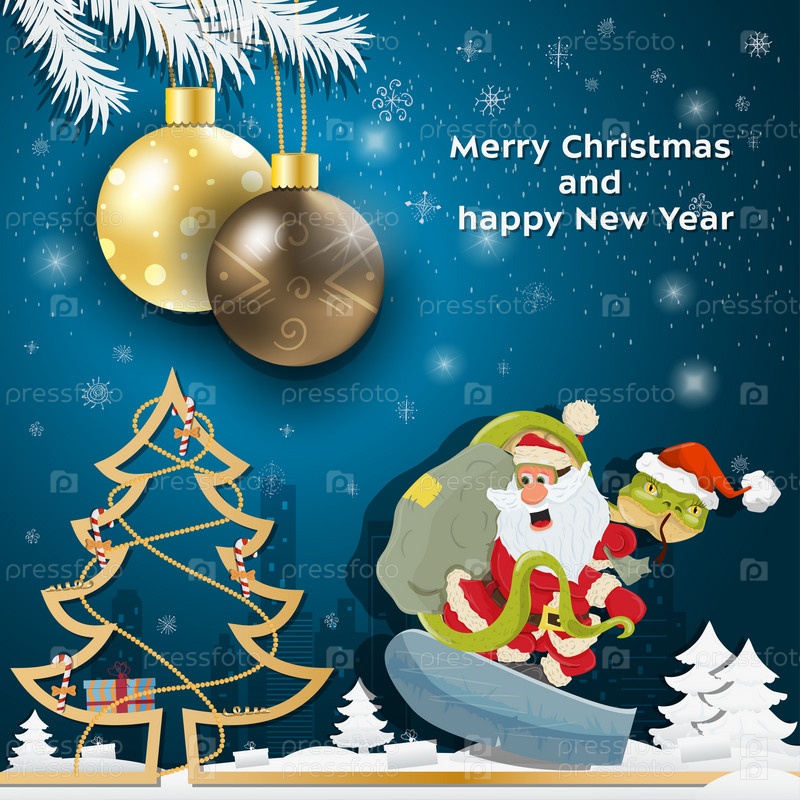 Рождественские и новогодние поздравления. Рождественские шары висят на ветках деревьев. Змея и Санта-Клаус катаются на сноуборде