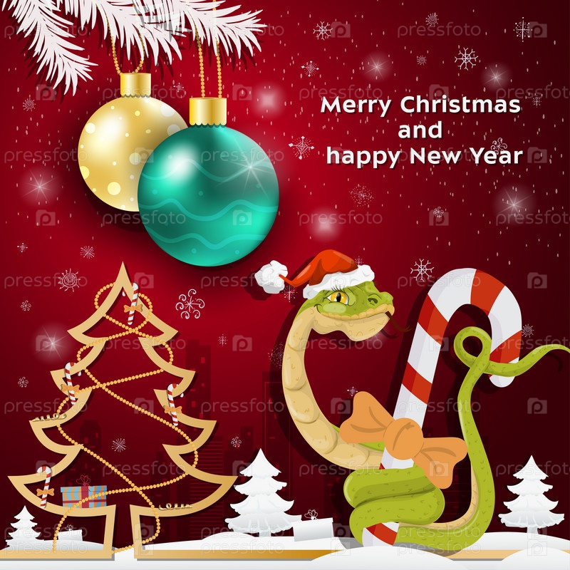 Рождественские и новогодние поздравления Рождественские шары висят на ветках дерева змея в шапке Санта-Клауса обвивает праздничную конфету