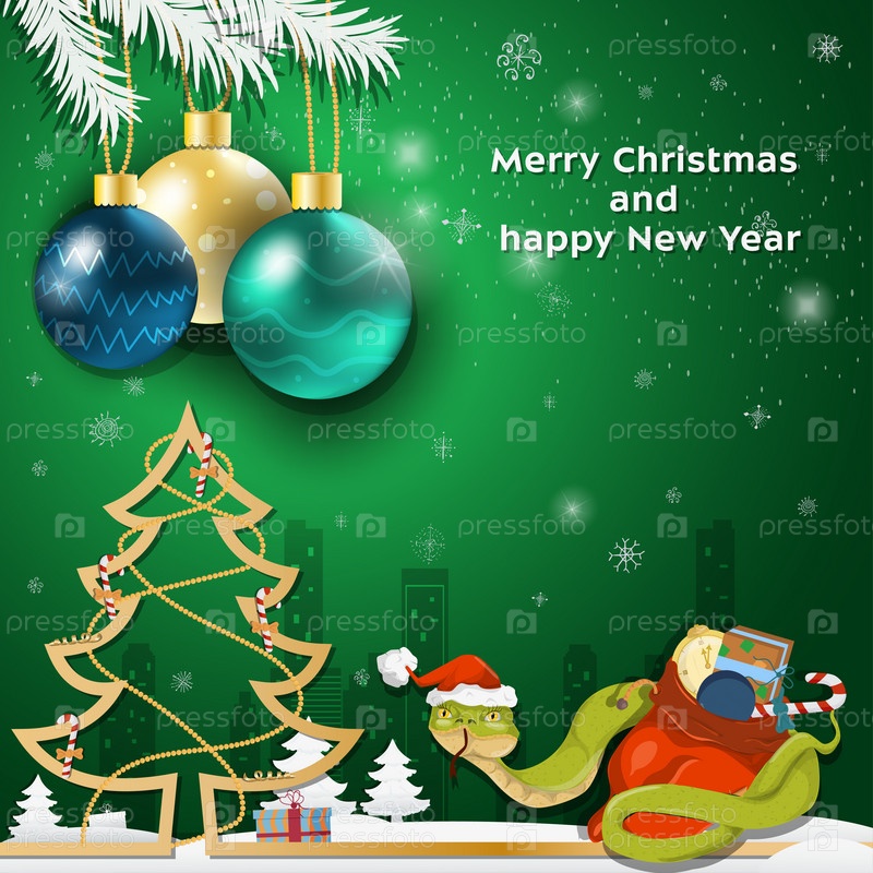 Рождественские и новогодние поздравления Рождественские шары висят на ветках деревьев змея в шапке Санта-Клауса обвивает мешок с подарками