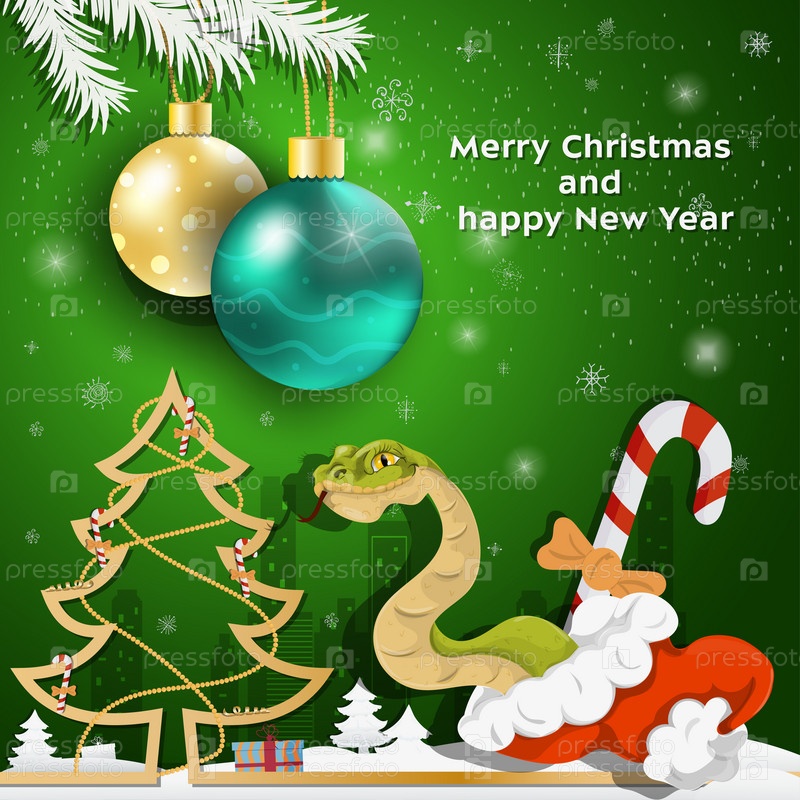 Рождественские и новогодние поздравления Рождественские шары висят на ветках деревьев змея выползает из шапки Санты