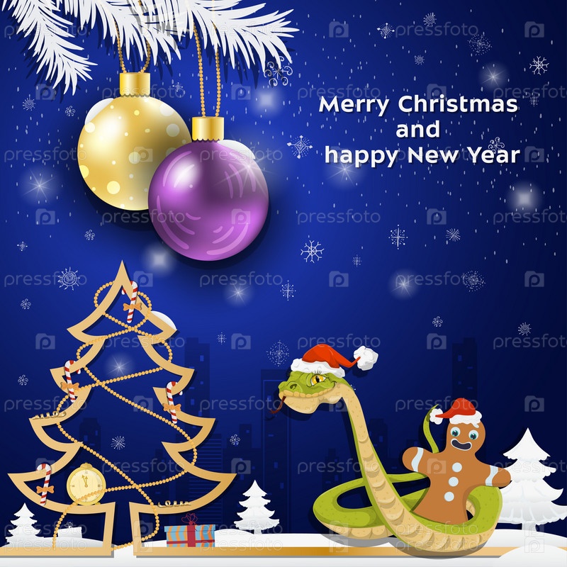 Рождественские и новогодние поздравления Рождественские шары висят на ветках деревьев Змея в шапке Санта-Клауса обвивает пряничного человечка