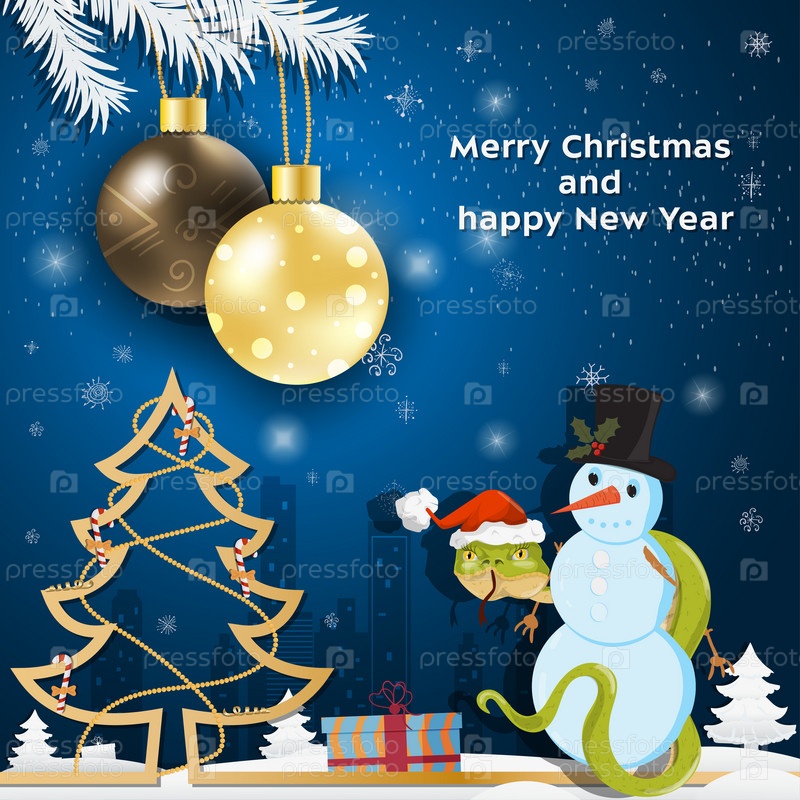 Рождественские и новогодние поздравления Рождественские шары висят на ветках деревьев Змея в шапке Санта-Клауса обвивает снеговика
