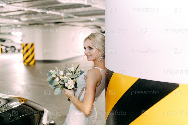 Невеста с букетом в руках находится на подземной парковке рядом с черной машиной