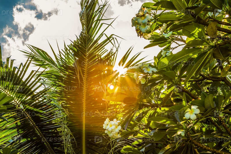 Солнечный свет пробивается сквозь пальмовые листья