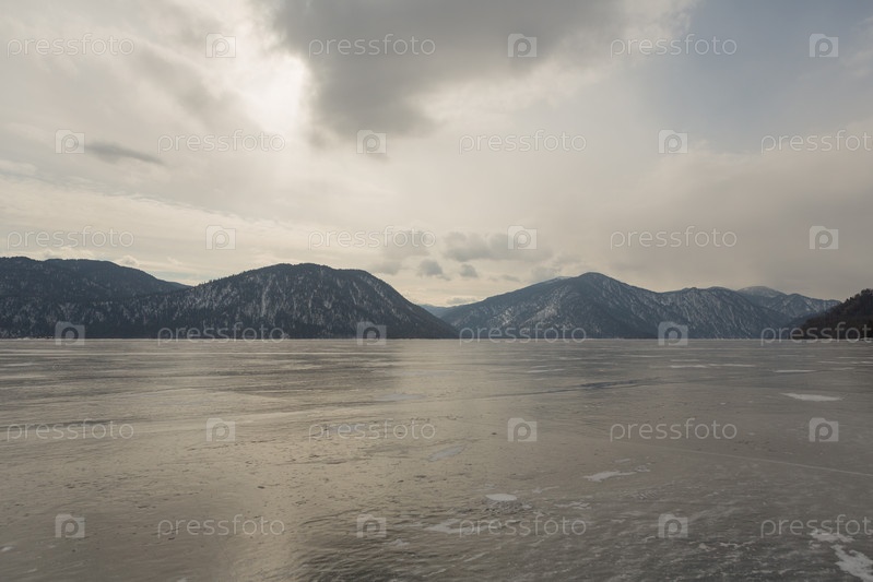 Вид на красивые рисунки на льду из трещин и пузырьков глубинного газа на поверхности Телецкого озера зимой, Россия