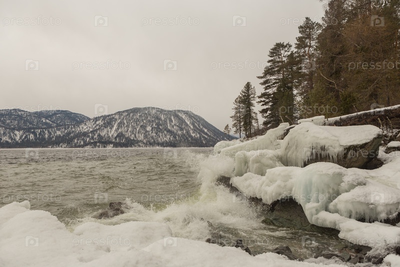Береговая линия Телецкого озера с грохочущими волнами зимой. Россия, Алтайский край