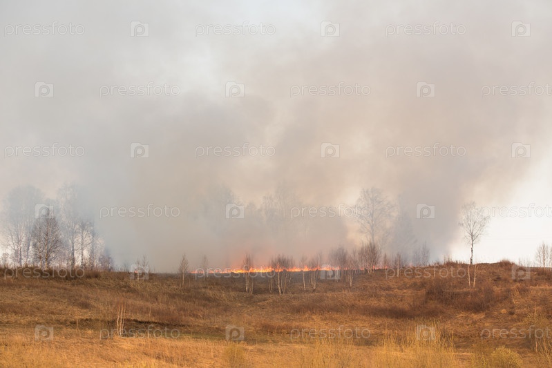 Лесной пожар горит, лесной пожар крупным планом в дневное время