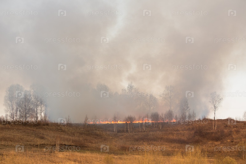 Лесной пожар горит, лесной пожар крупным планом в дневное время