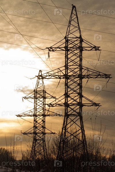 Силуэт высоковольтной электрической вышки на фоне заката и неба на фоне заката