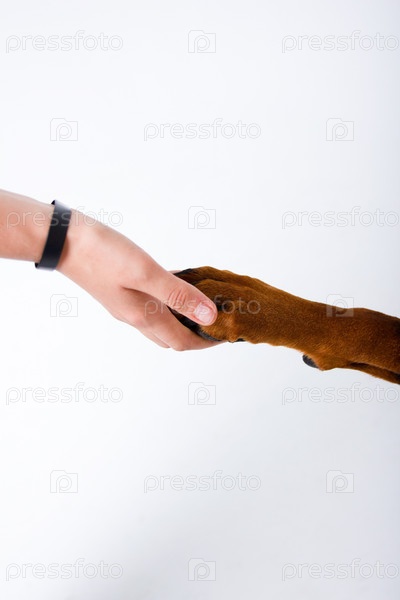 Собака дает лапу женщине. Собачья лапа в руке человека. Домашний питомец