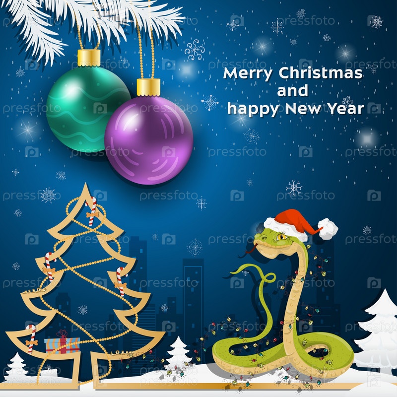 Рождественские и новогодние поздравления Рождественские шары висят на ветках деревьев Змея в шапке Санта-Клауса, обернутая в гирлянду