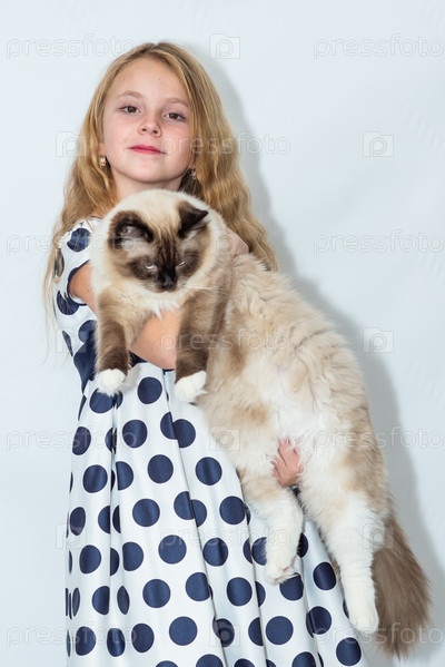 Девочка держит на руках красивую кошку. Ребенок и питомец, питомец