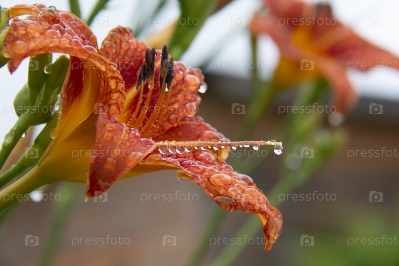 Оранжевый цветок лилейника с капельками воды после дождя