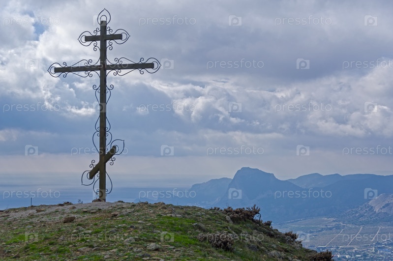 Православный крест на вершине горы Ай-Георгий (Манджил-Кая). Окрестности курортного городка Судак. Крым. Середина октября