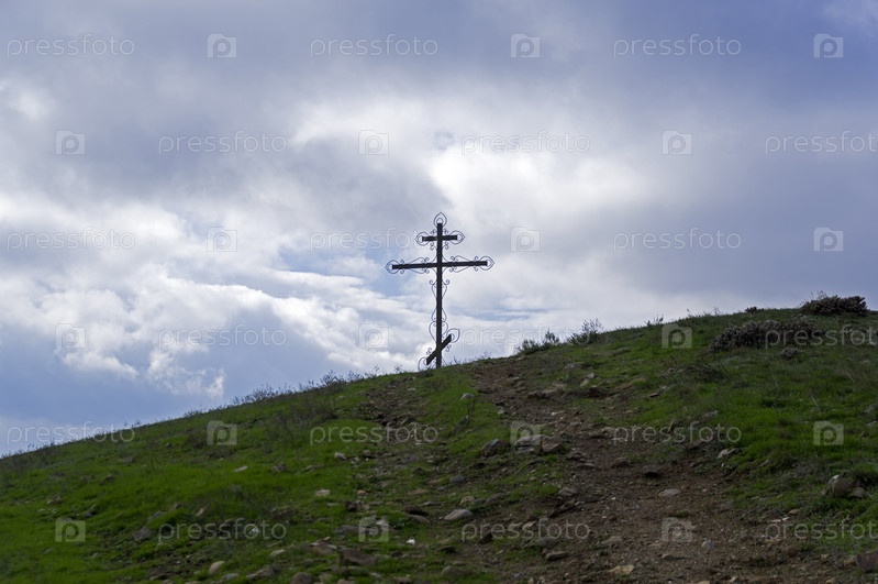Православный крест на вершине горы Ай-Георгий (Манджил-Кая). Окрестности курортного городка Судак. Крым. Середина октября