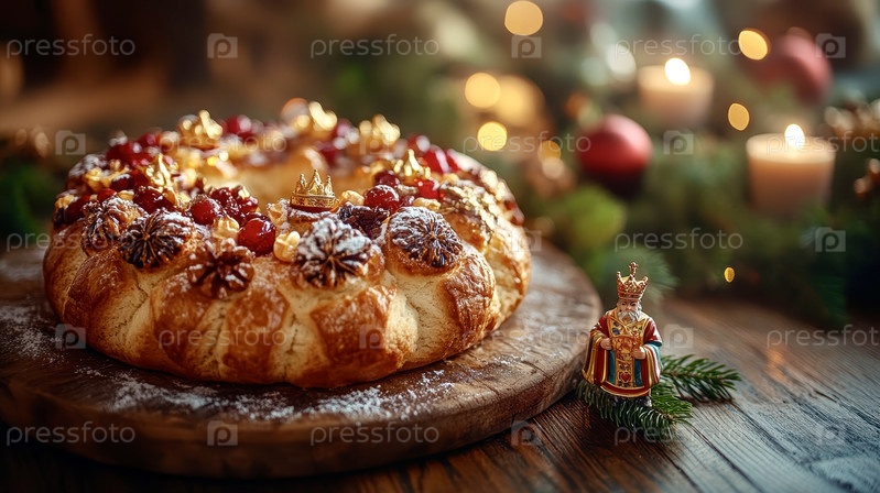 На столе стоит Galette des Rois, рядом с которой маленькая фигура короля.Это празднование Дня трех царей