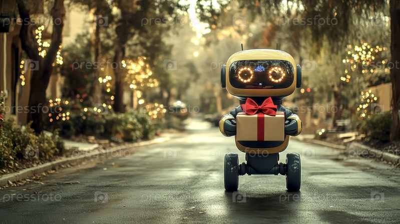 Крупный план робота-доставщика, едущего по улице. В его руках коробка с рождественским подарком, перевязанная красной лентой и украшенная ярко-красным бантом