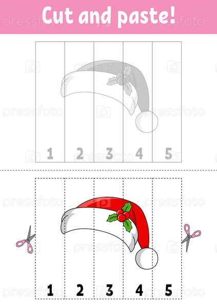 Изучаем цифры от 1 до 5. Вырезаем и склеиваем. Персонаж мультфильма. Образовательный развивающий рабочий лист. Рождественская тема. Игра для детей. Страница с заданиями. Цветная изолированная векторная иллюстрация