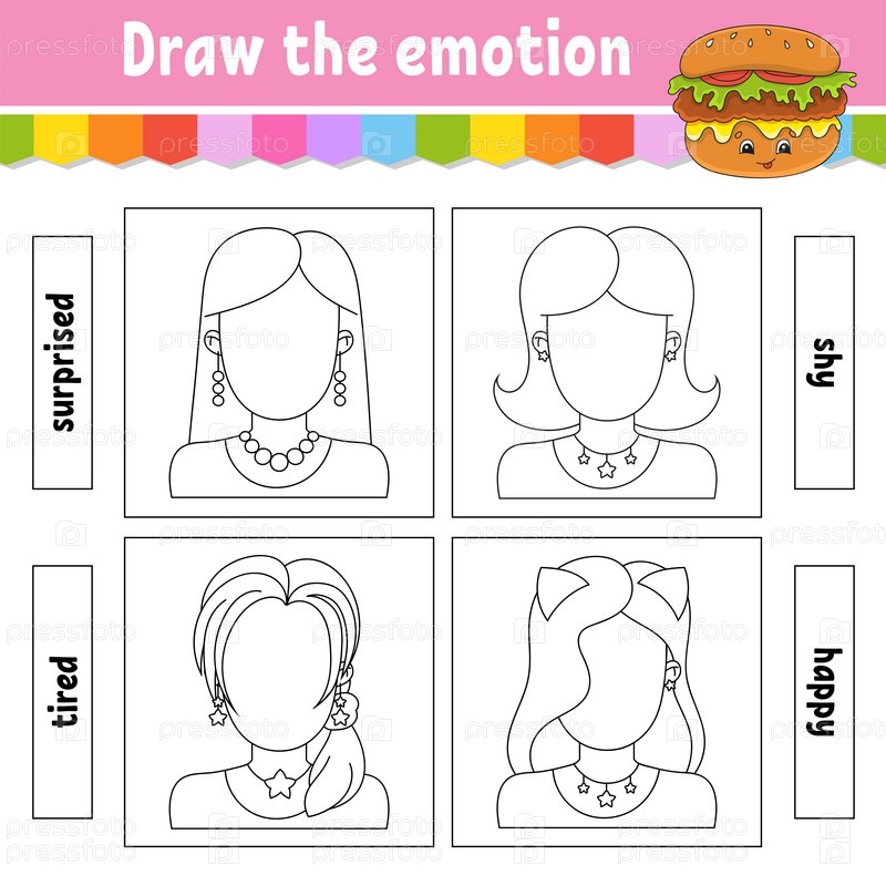 Нарисуй эмоцию. Рабочий лист заверши лицо. Раскраска для детей. Веселый персонаж. Векторная иллюстрация. Черный контурный силуэт. Изолирован на белом фоне