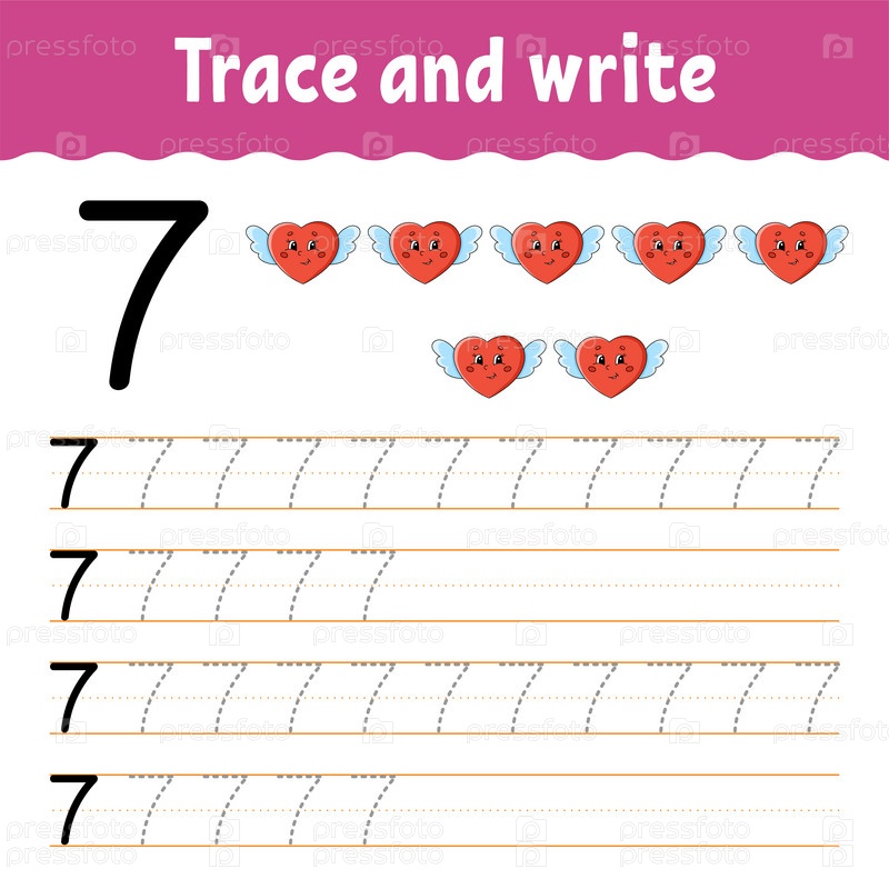 Изучайте цифры. Обводка и письмо. Практика письма. Образовательный развивающий рабочий лист. Цветная страница с заданиями. Изолированная векторная иллюстрация в милом мультяшном стиле