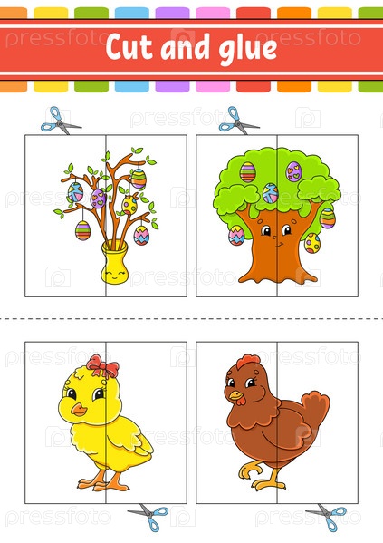 Разрезай и играй. Бумажная игра с клеем. Флэш-карточки. Образовательный рабочий лист. Страница с заданиями. Забавный персонаж. Мультяшный стиль. Векторная иллюстрация