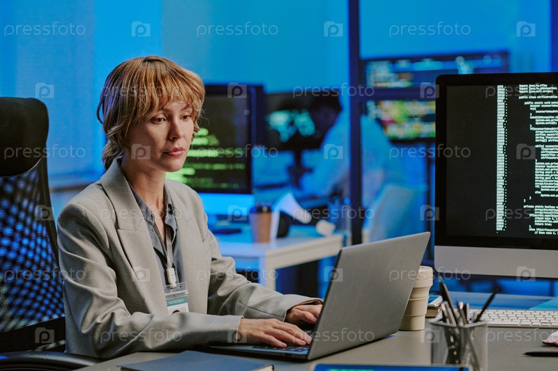 Молодая женщина печатает на ноутбуке в офисе кибербезопасности