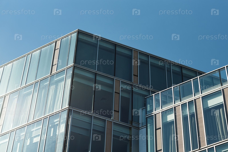 Офисное здание в минималистском геометрическом дизайне против голубого стеклянного неба в городе