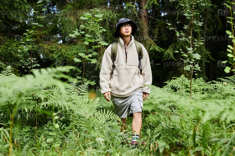 Турист, идущий к камере в лесу